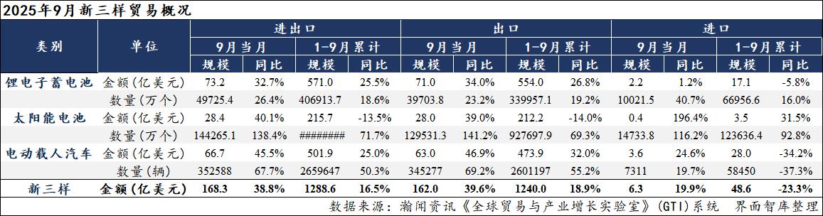 据界面智库和瀚闻资讯统计,2025年1-9月,我国“新三样”进出口总额1288.6亿美元,同比增长16.5%。其中,出口1240.0亿美元,同比增长18.9%;进口48.6亿美元,同比下降23.3%。9月当月,我国“新三样”进出口总额168.3亿美元,环比下降2.8%,同比增长38.8%。其中,出口162.0亿美元,环比下降2.4%,同比增速加快5.3个百分点至39.6%,为2023年6月以来新高;进口6.3亿美元,环比下降11.6%,同比增长19.9%。