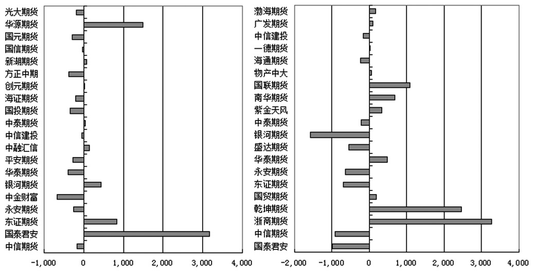 空头前20席位中,增持空单的有11家。其中,增持多单数量超过500手的有4家,分别为浙商期货席位、乾坤期货席位、南华期货席位和国联期货席位,分别大幅增加3272手、2457手、675手和1083手。另外,增持空单数量介于100手至500手的有5家,分别为国贸期货席位、华泰期货席位、紫金天风期货席位、广发期货席位和渤海期货席位,分别增加188手、476手、326手、105手和173手。剩余2家增持不足100手。
