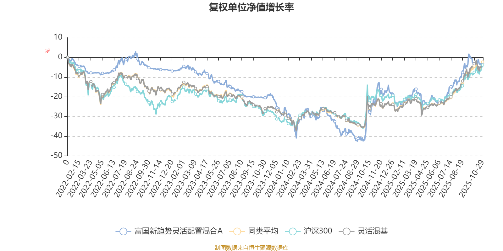截至10月29日,富国新趋势灵活配置混合A近三个月复权单位净值增长率为9.02%,位于同类可比基金777/1287;近半年复权单位净值增长率为27.34%,位于同类可比基金583/1287;近一年复权单位净值增长率为25.09%,位于同类可比基金609/1287;近三年复权单位净值增长率为2.71%,位于同类可比基金984/1286。