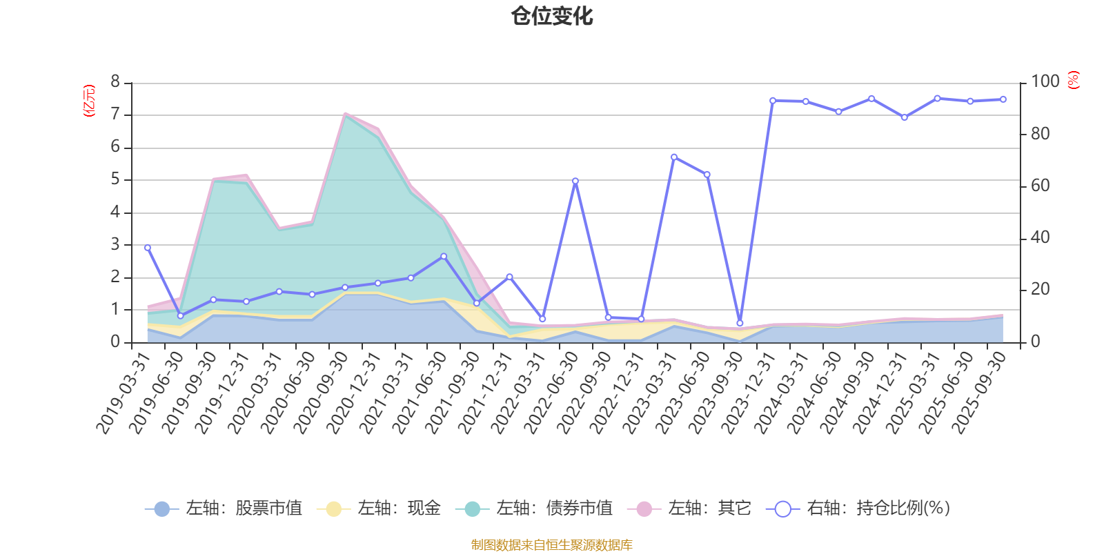 据定期报告数据统计,近三年平均股票仓位为74.06%,同类平均为72.35%。2025年一季度末基金达到94%的最高仓位,2023年三季度末最低,为7.51%。