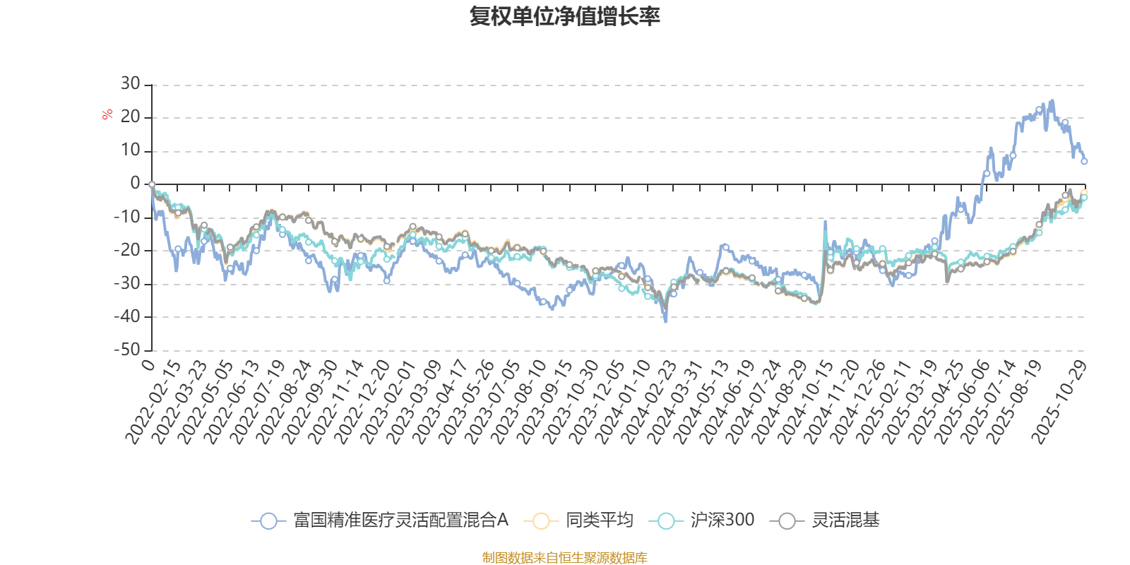 截至10月29日,富国精准医疗灵活配置混合A近三个月复权单位净值增长率为-11.31%,位于同类可比基金1281/1287;近半年复权单位净值增长率为15.31%,位于同类可比基金910/1287;近一年复权单位净值增长率为33.72%,位于同类可比基金409/1287;近三年复权单位净值增长率为43.74%,位于同类可比基金219/1286。