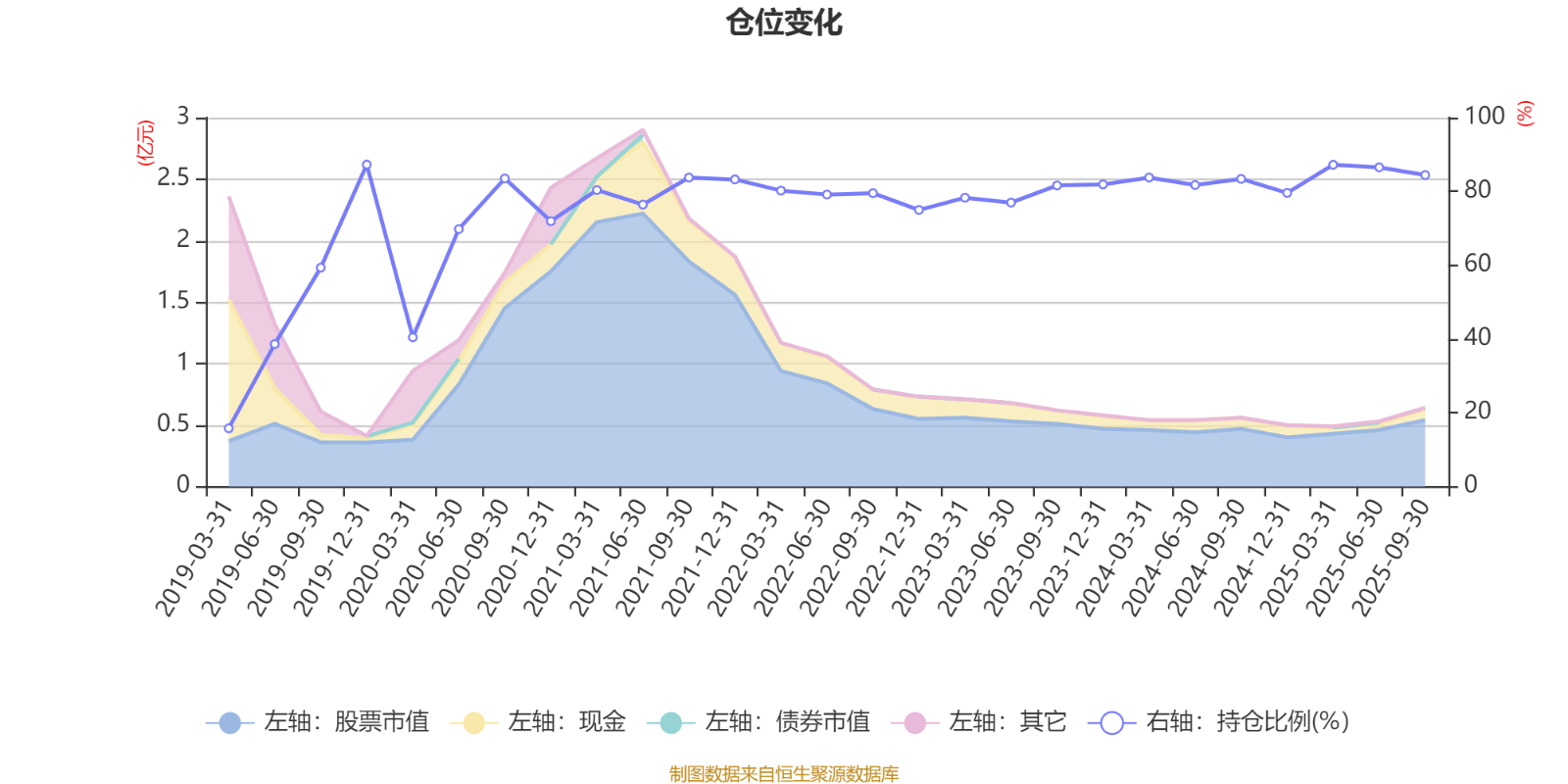 据定期报告数据统计,近三年平均股票仓位为81.69%,同类平均为72.34%。2019年末基金达到87.25%的最高仓位,2019年一季度末最低,为15.78%。