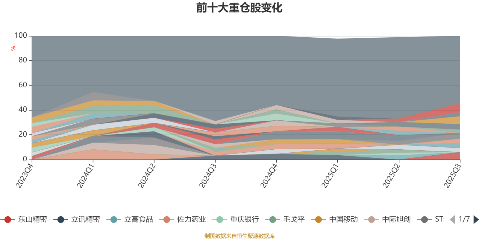 截至2025年三季度末,基金十大重仓股分别是新易盛、工业富联、东山精密、ST华通、信达生物、紫金矿业、重庆农村商业银行、腾讯控股、东材科技、春立医疗。