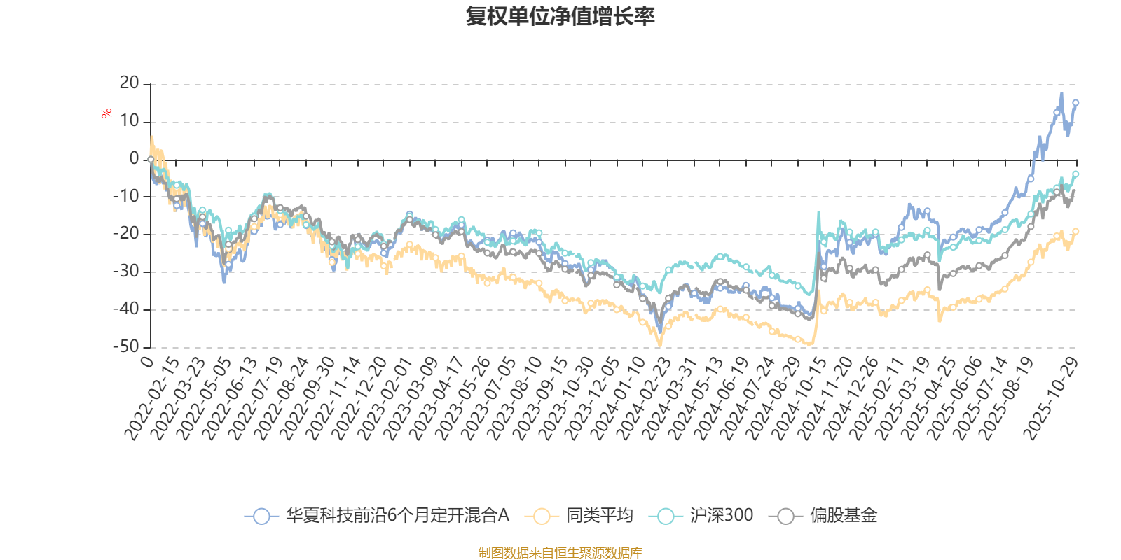 截至10月29日,华夏科技前沿6个月定开混合A近三个月复权单位净值增长率为24.07%,位于同类可比基金137/621;近半年复权单位净值增长率为45.72%,位于同类可比基金118/621;近一年复权单位净值增长率为52.28%,位于同类可比基金111/611;近三年复权单位净值增长率为56.64%,位于同类可比基金59/518。