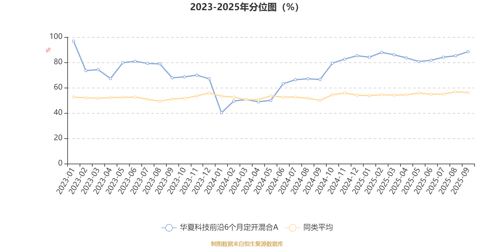 通过所选区间该基金净值增长率分位图,可以观察该基金与同类基金业绩比较情况。图为坐标原点到区间内某时点的净值增长率在同类基金中的分位数。