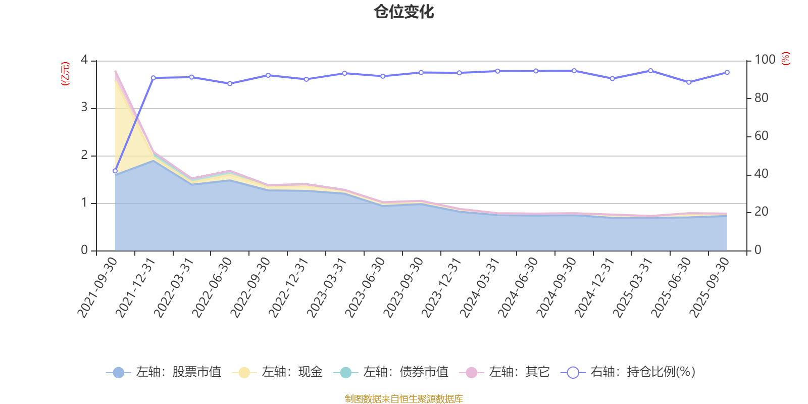 据定期报告数据统计,近三年平均股票仓位为92.84%,同类平均为83.73%。2025年一季度末基金达到94.69%的最高仓位,2021年三季度末最低,为41.99%。