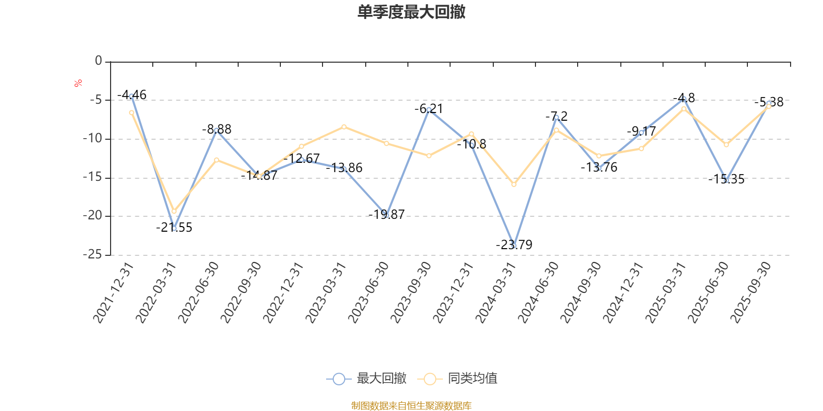 截至10月28日,基金近三年最大回撤为43.45%,同类可比基金排名266/363。单季度最大回撤出现在2024年一季度,为23.79%。
