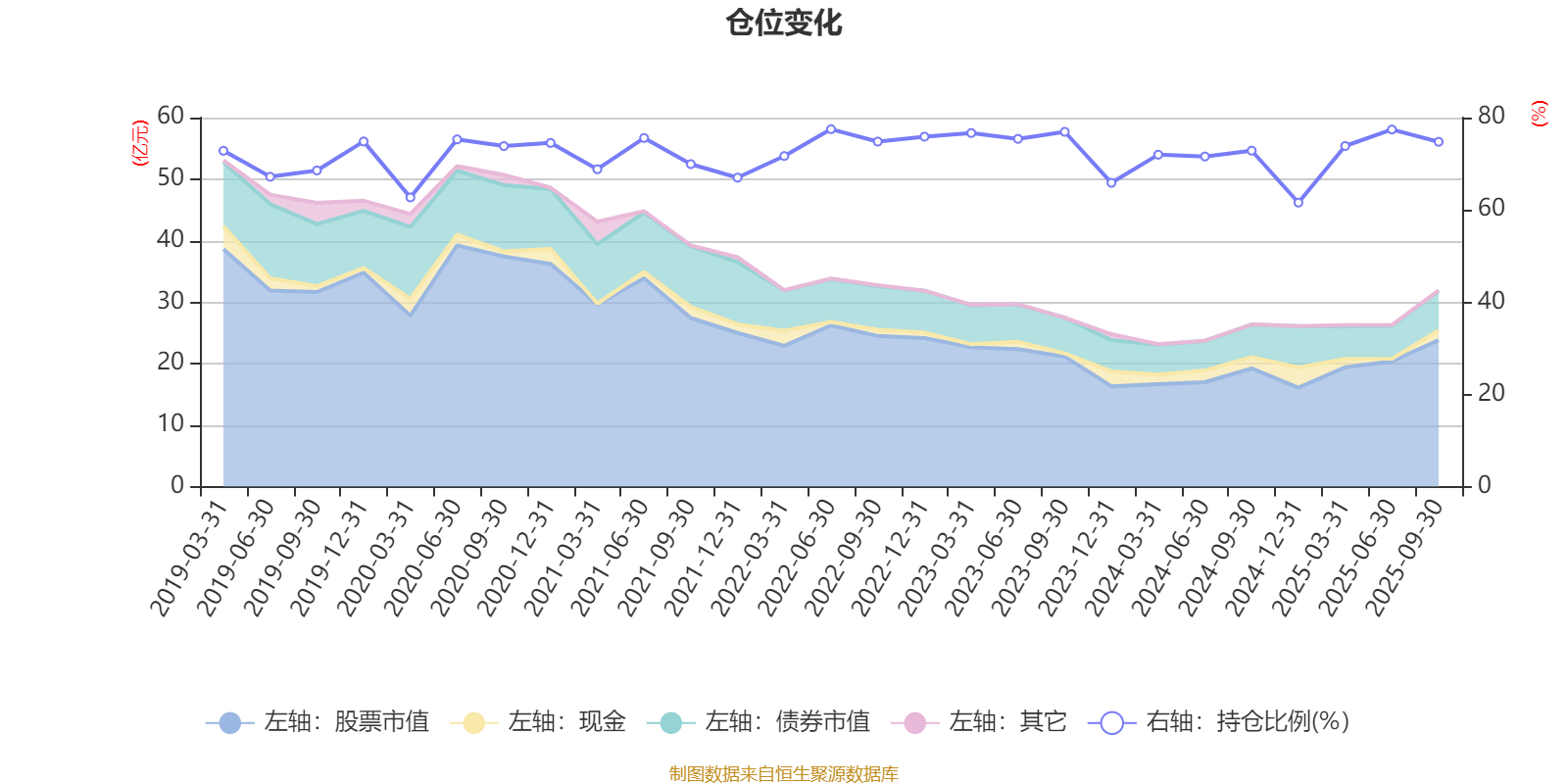 据定期报告数据统计,近三年平均股票仓位为72.89%,同类平均为72.35%。2022年上半年末基金达到77.49%的最高仓位,2024年末最低,为61.57%。