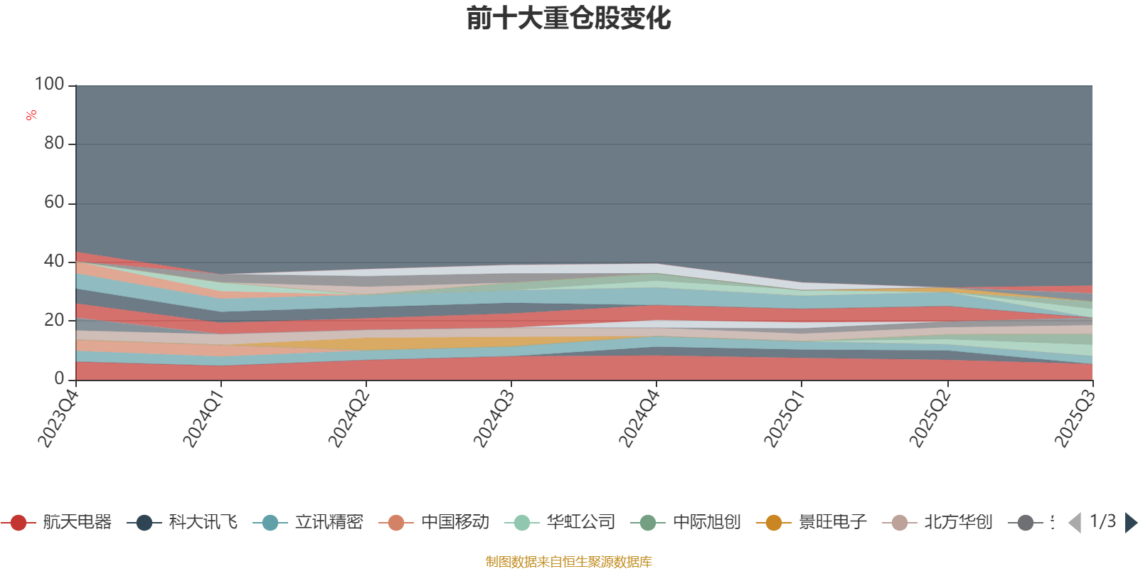 截至2025年三季度末,基金十大重仓股分别是航天电器、华虹公司、中际旭创、恒瑞医药、北方华创、拓普集团、立讯精密、兆易创新、海光信息、安集科技。