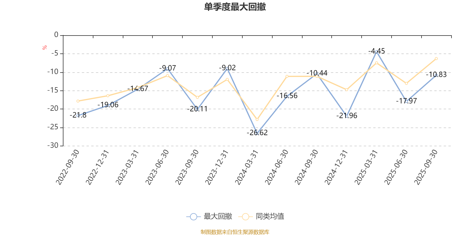 截至10月29日,基金近三年最大回撤为51.7%,同类可比基金排名39/61。单季度最大回撤出现在2024年一季度,为26.62%。