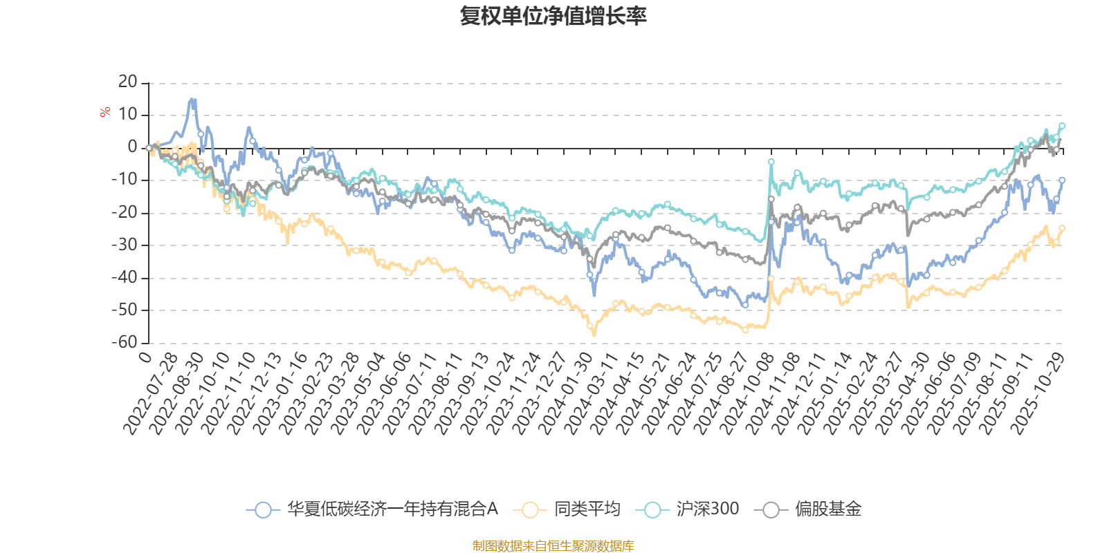 截至10月29日,华夏低碳经济一年持有混合A近三个月复权单位净值增长率为15.11%,位于同类可比基金71/100;近半年复权单位净值增长率为49.31%,位于同类可比基金20/99;近一年复权单位净值增长率为21.28%,位于同类可比基金64/90;近三年复权单位净值增长率为-5.03%,位于同类可比基金36/62。