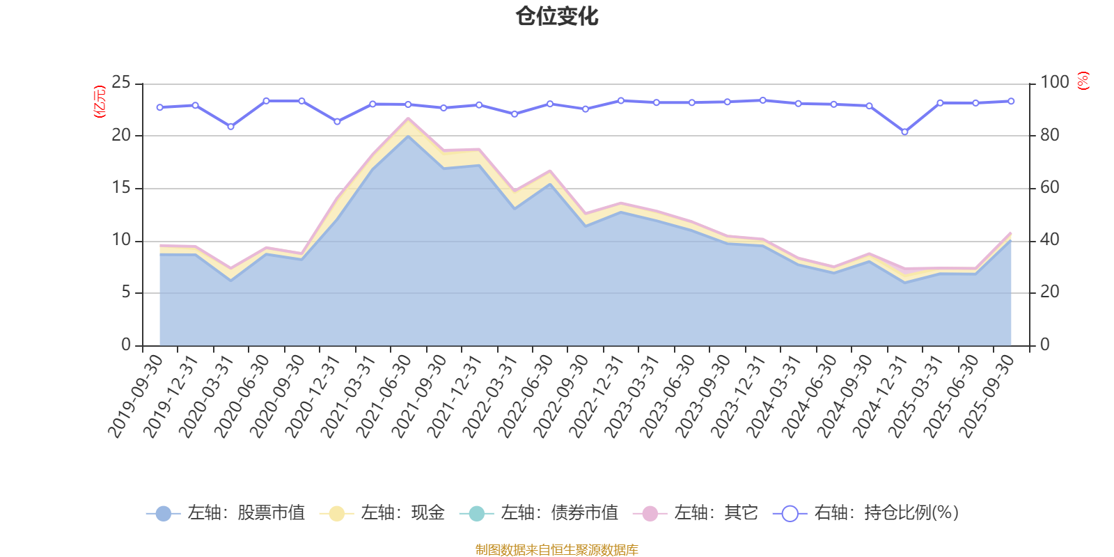据定期报告数据统计,近三年平均股票仓位为91.8%,同类平均为85.99%。2023年末基金达到93.63%的最高仓位,2024年末最低,为81.58%。