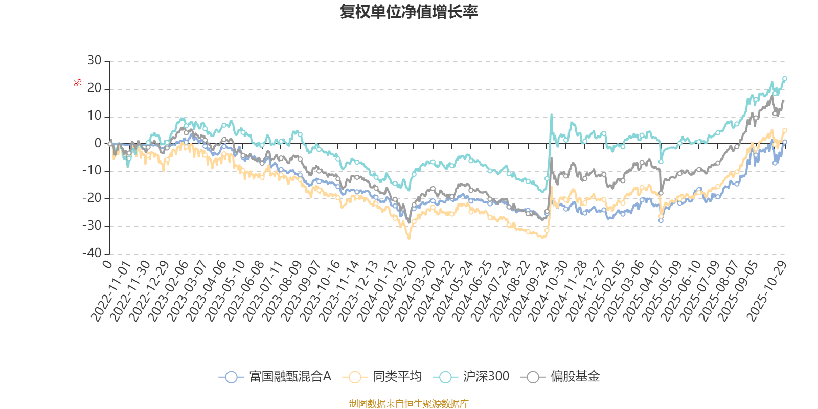 截至10月29日,富国融甄混合A近三个月复权单位净值增长率为16.11%,位于同类可比基金273/621;近半年复权单位净值增长率为26.70%,位于同类可比基金374/621;近一年复权单位净值增长率为31.05%,位于同类可比基金302/611;近三年复权单位净值增长率为1.03%,位于同类可比基金418/518。