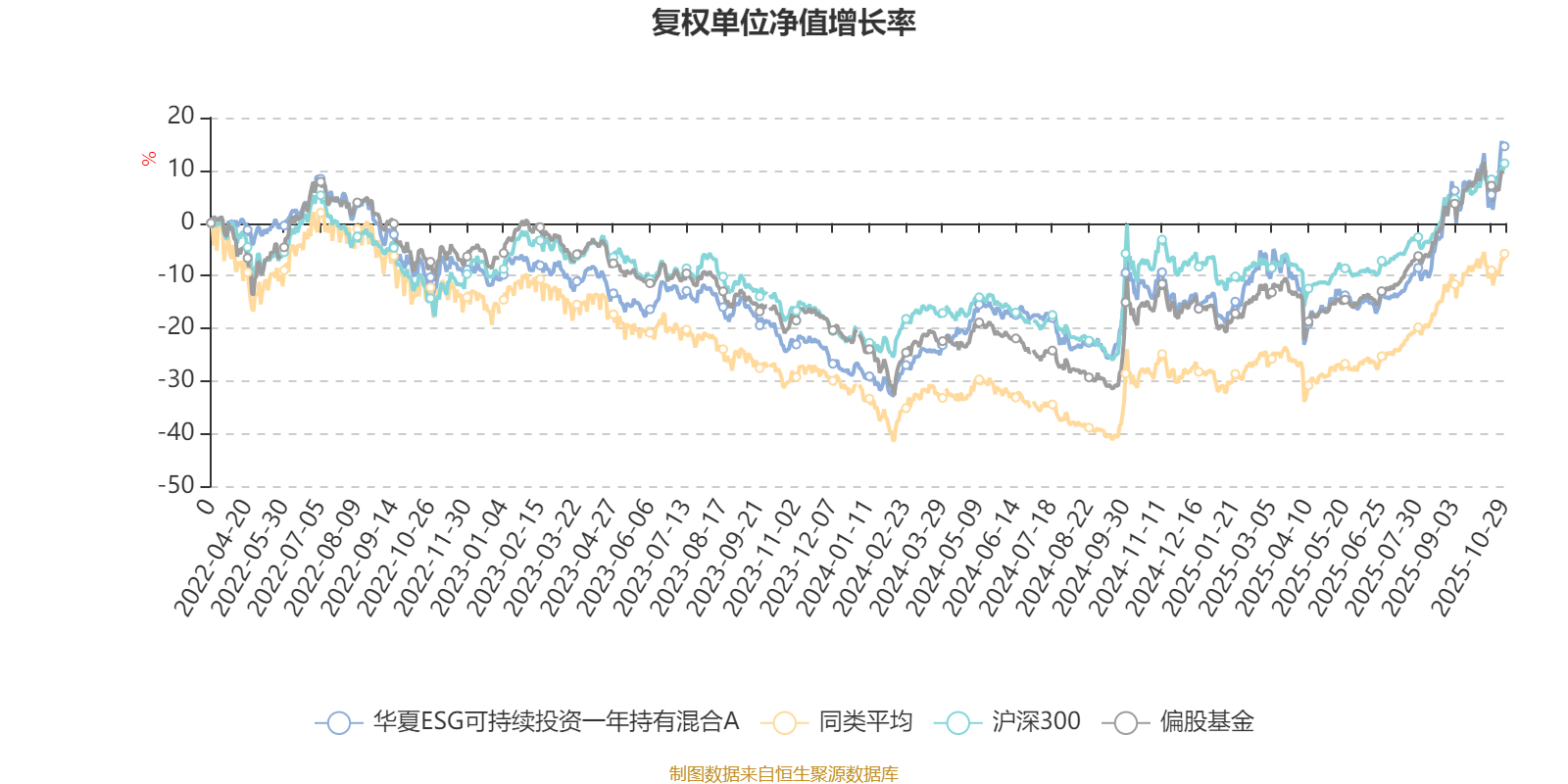截至10月29日,华夏ESG可持续投资一年持有混合A近三个月复权单位净值增长率为24.23%,位于同类可比基金133/621;近半年复权单位净值增长率为37.23%,位于同类可比基金200/621;近一年复权单位净值增长率为31.27%,位于同类可比基金298/611;近三年复权单位净值增长率为32.66%,位于同类可比基金167/518。