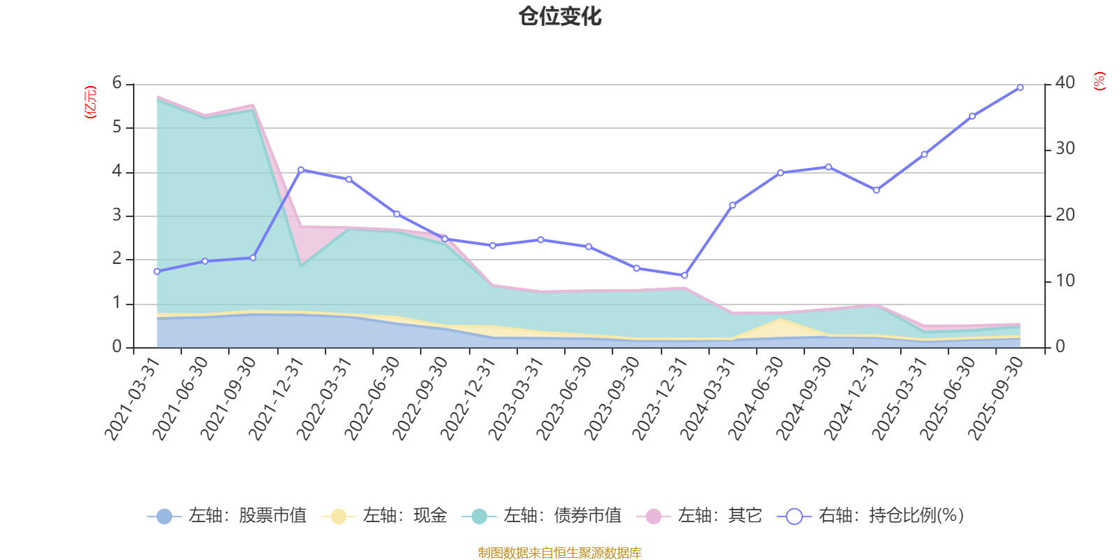 据定期报告数据统计,近三年平均股票仓位为22.79%,同类平均为19.13%。2025年三季度末基金达到39.48%的最高仓位,2023年末最低,为10.95%。