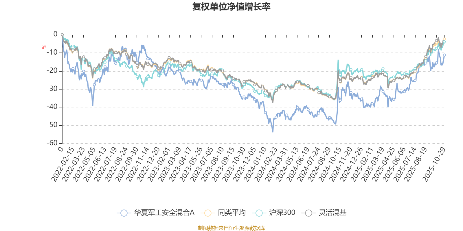 截至10月29日,华夏军工安全混合A近三个月复权单位净值增长率为6.01%,位于同类可比基金894/1287;近半年复权单位净值增长率为37.47%,位于同类可比基金359/1287;近一年复权单位净值增长率为29.12%,位于同类可比基金514/1287;近三年复权单位净值增长率为-3.61%,位于同类可比基金1086/1286。