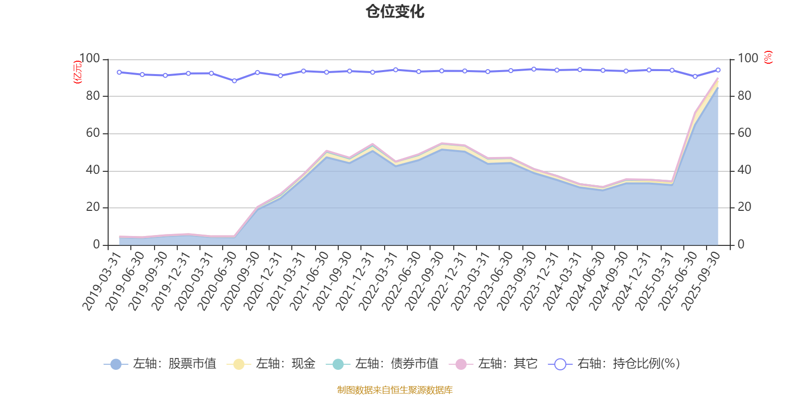 据定期报告数据统计,近三年平均股票仓位为93.77%,同类平均为72.35%。2023年三季度末基金达到94.68%的最高仓位,2020年上半年末最低,为88.42%。