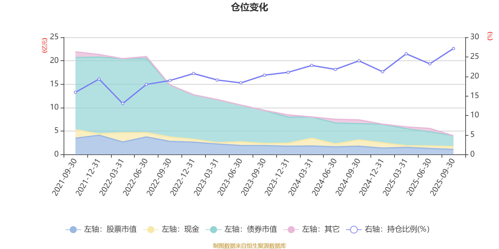 据定期报告数据统计,近三年平均股票仓位为22.12%,同类平均为19.14%。2025年三季度末基金达到27.15%的最高仓位,2022年一季度末最低,为13.06%。