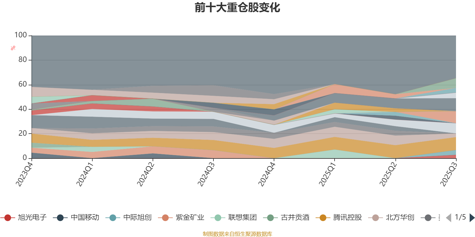 该基金持股集中度较高。截至2025年三季度末,基金十大重仓股分别是中芯国际、腾讯控股、寒武纪、宁德时代、新易盛、五矿资源、中际旭创、中金公司、北方华创、旭光电子。