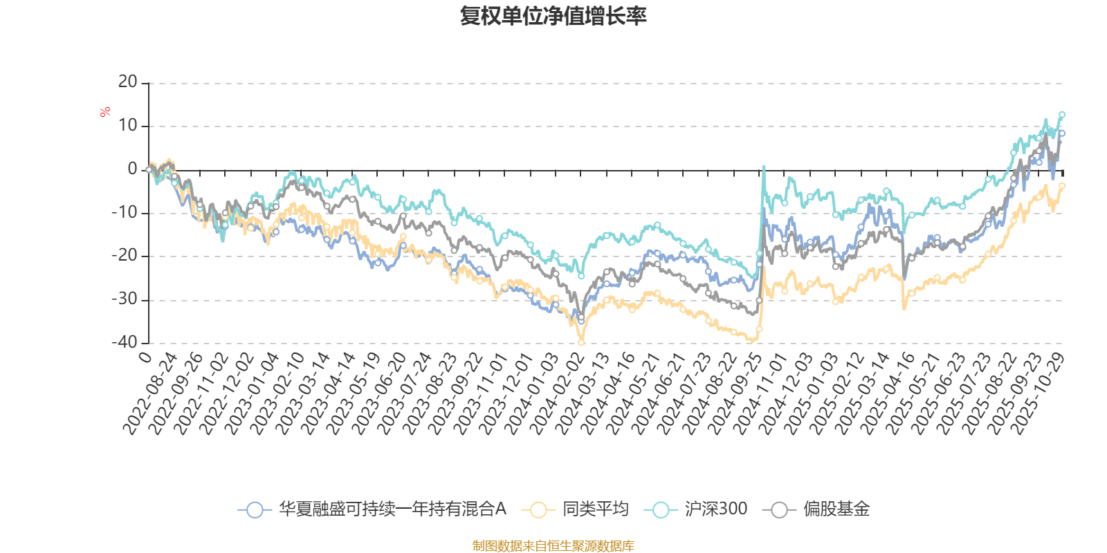 截至10月29日,华夏融盛可持续一年持有混合A近三个月复权单位净值增长率为20.71%,位于同类可比基金192/621;近半年复权单位净值增长率为33.70%,位于同类可比基金257/621;近一年复权单位净值增长率为26.77%,位于同类可比基金352/611;近三年复权单位净值增长率为28.53%,位于同类可比基金195/518。