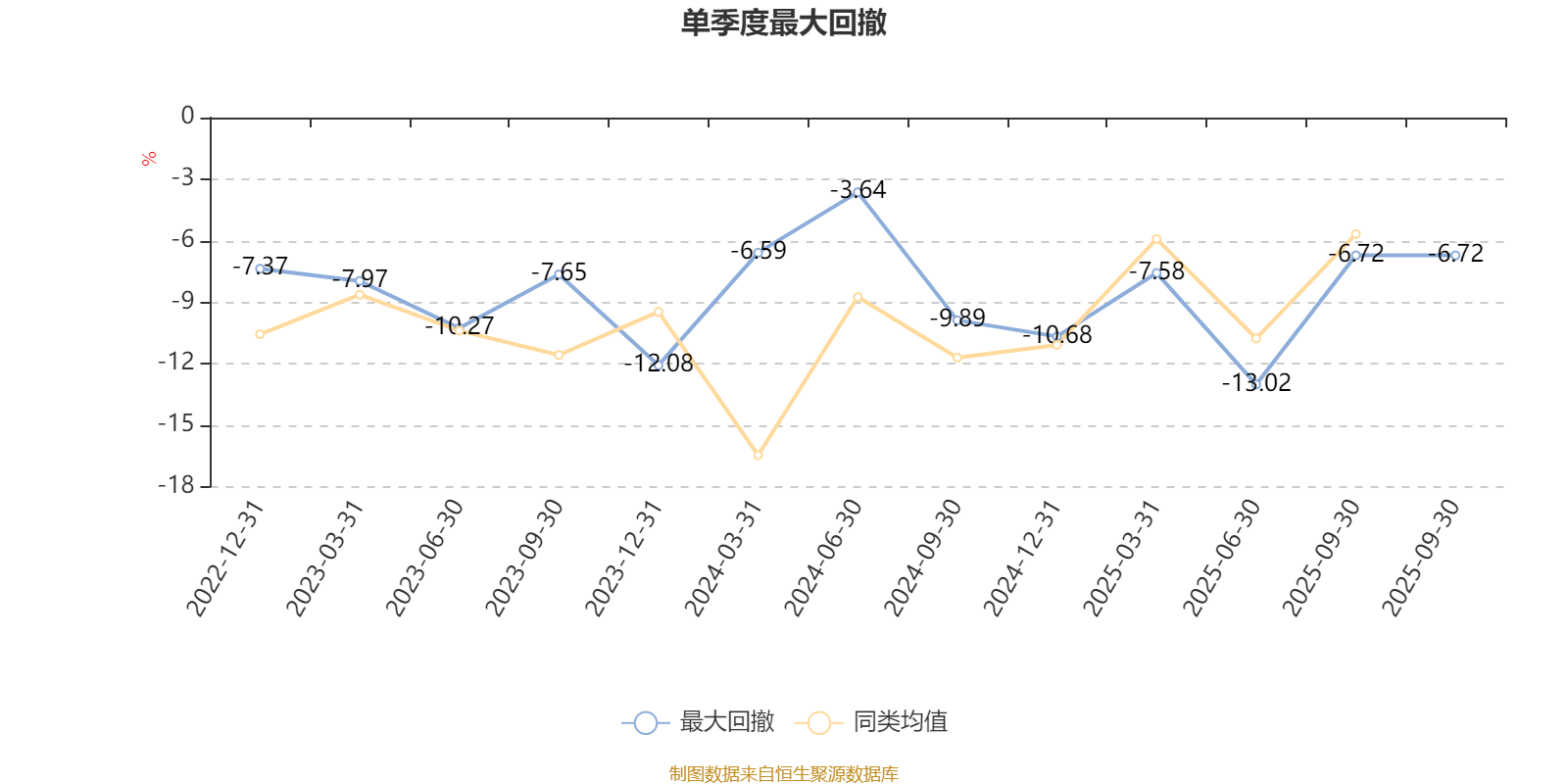 截至10月29日,基金近三年最大回撤为27.6%,同类可比基金排名74/513。单季度最大回撤出现在2025年二季度,为13.02%。
