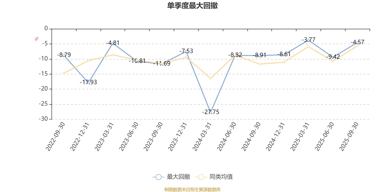 截至10月29日,基金近三年最大回撤为40.12%,同类可比基金排名352/513。单季度最大回撤出现在2024年一季度,为27.75%。