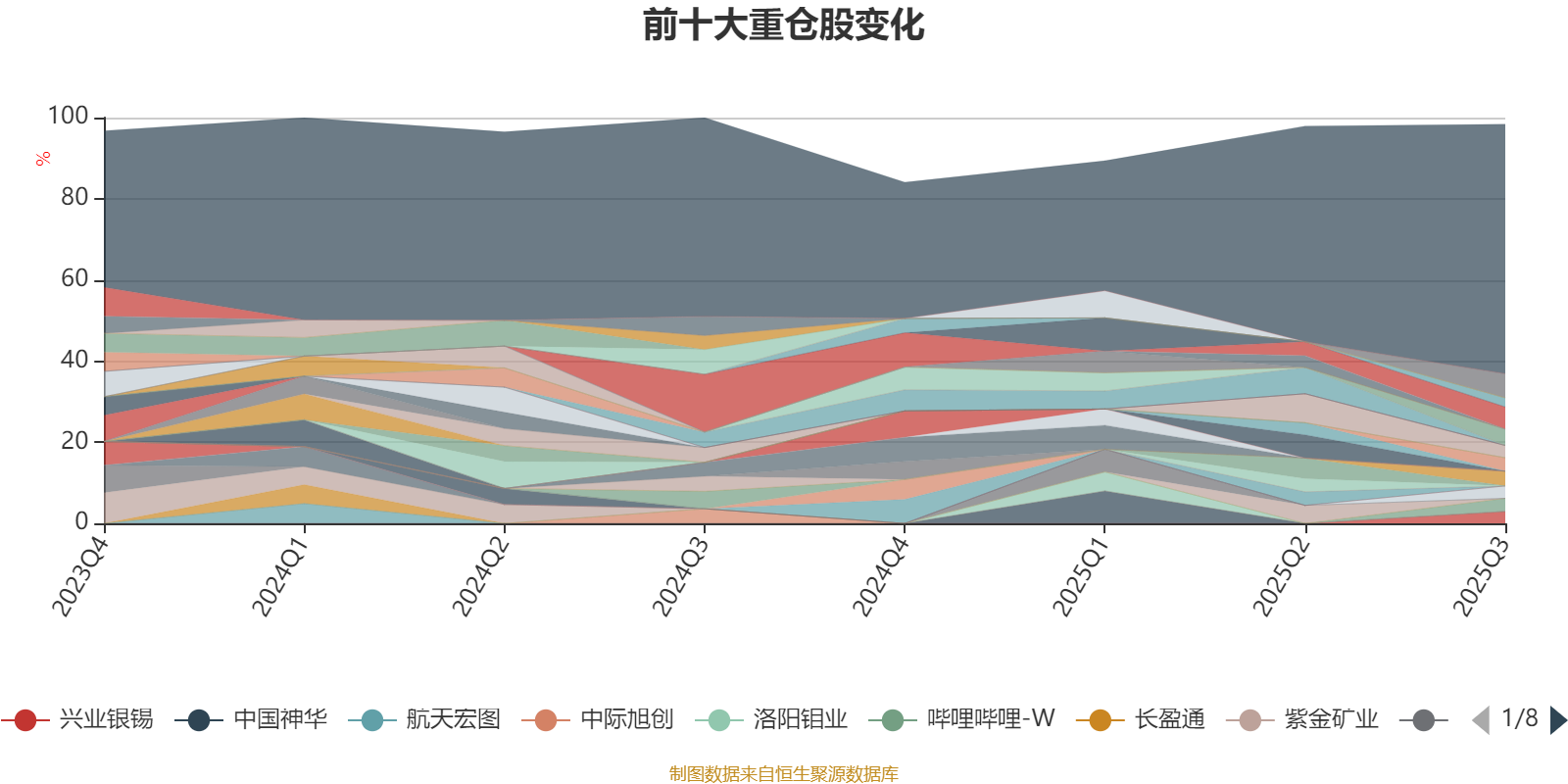 截至2025年三季度末,基金十大重仓股分别是华友钴业、阿里巴巴-W、中国人寿、香港交易所、厦门钨业、哔哩哔哩-W、北方华创、湖南黄金、兴业银锡、中国电信。