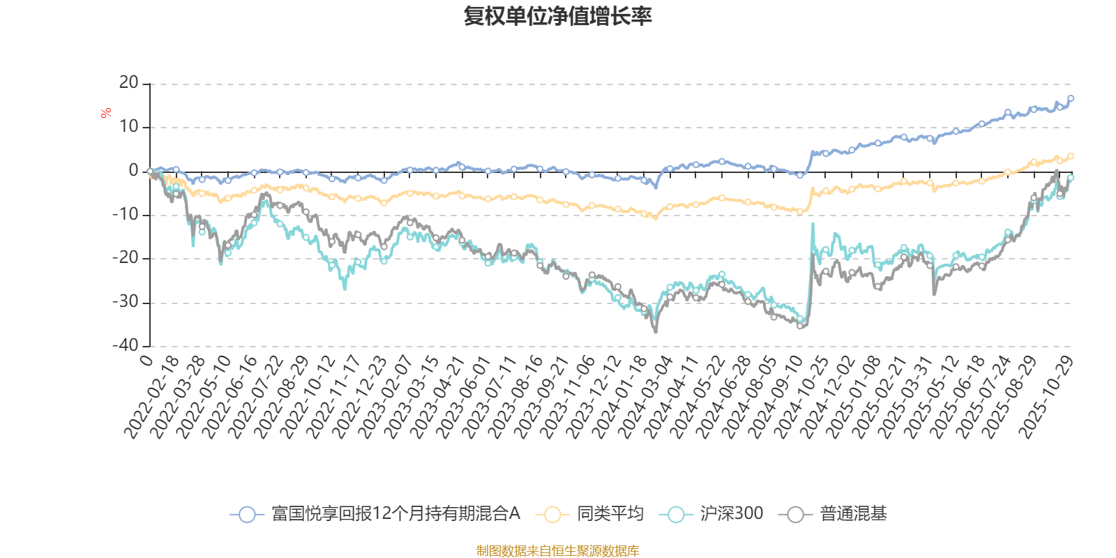 截至10月29日,富国悦享回报12个月持有期混合A近三个月复权单位净值增长率为3.33%,位于同类可比基金242/629;近半年复权单位净值增长率为7.41%,位于同类可比基金198/629;近一年复权单位净值增长率为12.12%,位于同类可比基金104/623;近三年复权单位净值增长率为19.65%,位于同类可比基金103/557。