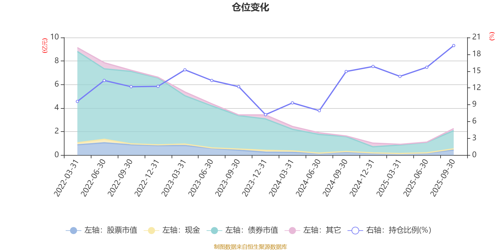 据定期报告数据统计,近三年平均股票仓位为13.14%,同类平均为19.14%。2025年三季度末基金达到19.56%的最高仓位,2023年末最低,为7.23%。