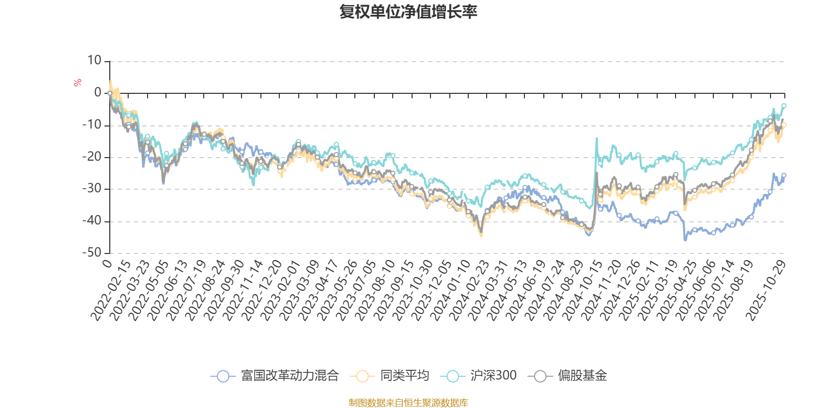 截至10月29日,富国改革动力混合近三个月复权单位净值增长率为23.55%,位于同类可比基金65/265;近半年复权单位净值增长率为30.65%,位于同类可比基金126/265;近一年复权单位净值增长率为16.58%,位于同类可比基金214/265;近三年复权单位净值增长率为-7.84%,位于同类可比基金234/253。