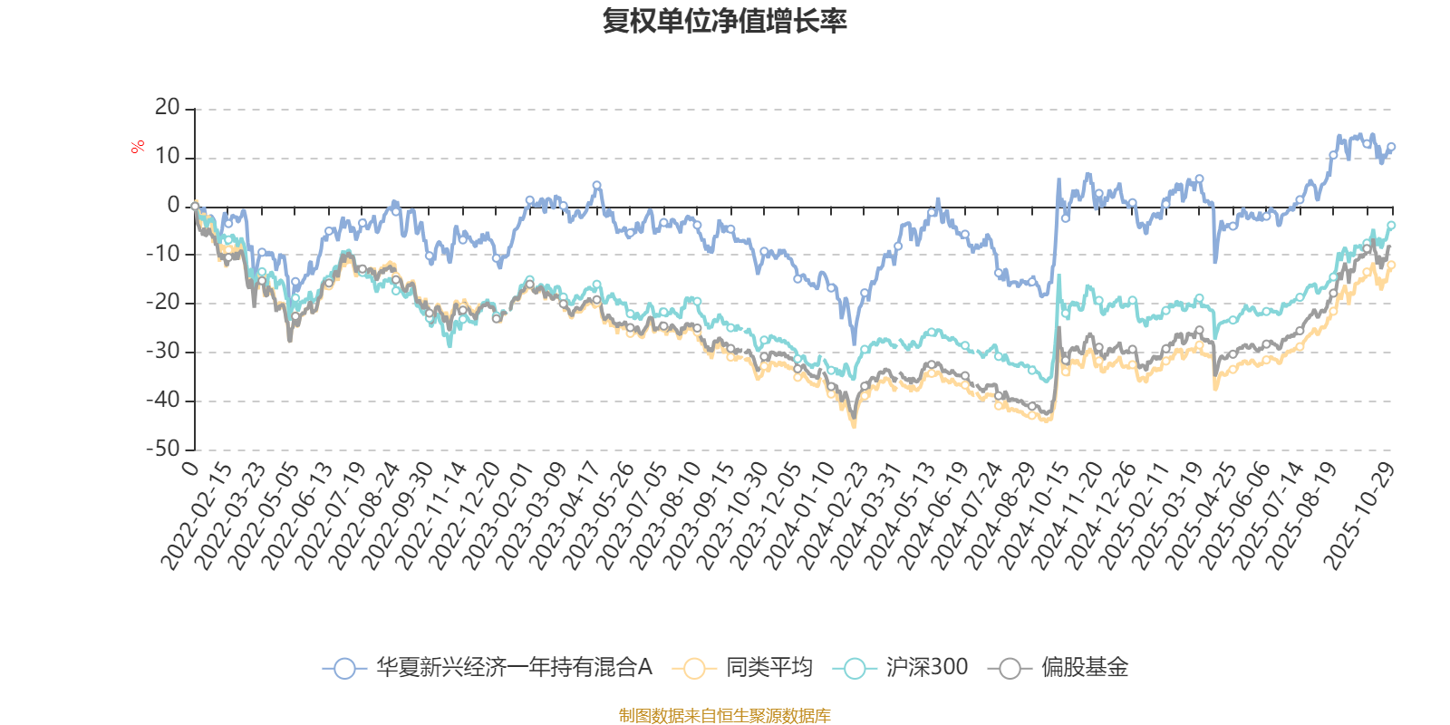 截至10月29日,华夏新兴经济一年持有混合A近三个月复权单位净值增长率为7.46%,位于同类可比基金146/185;近半年复权单位净值增长率为17.48%,位于同类可比基金155/185;近一年复权单位净值增长率为9.75%,位于同类可比基金170/181;近三年复权单位净值增长率为26.20%,位于同类可比基金78/175。