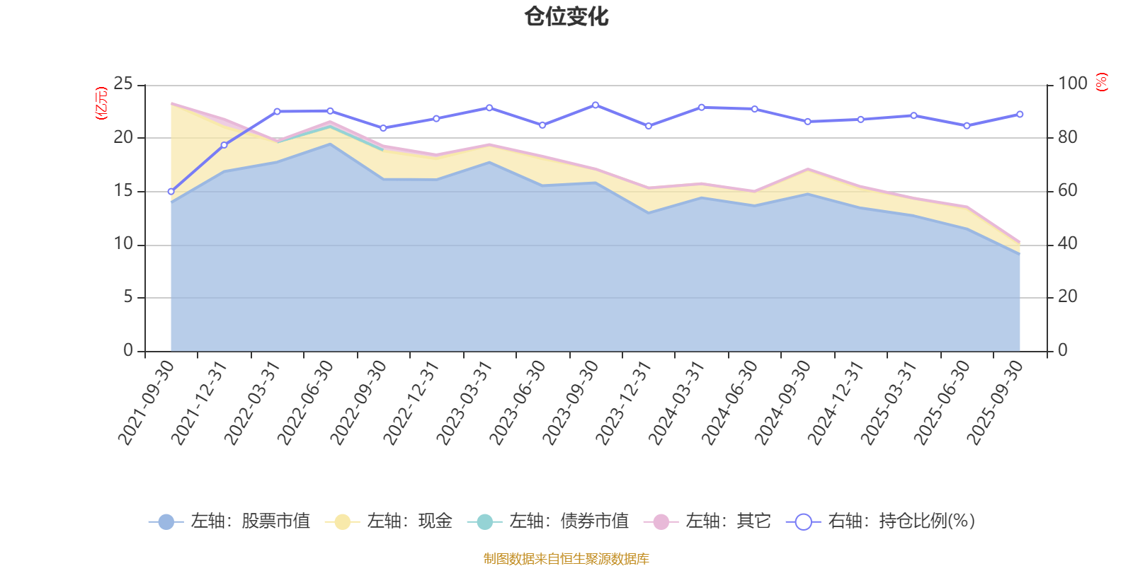 据定期报告数据统计,近三年平均股票仓位为88.22%,同类平均为87.62%。2023年三季度末基金达到92.45%的最高仓位,2021年三季度末最低,为59.98%。
