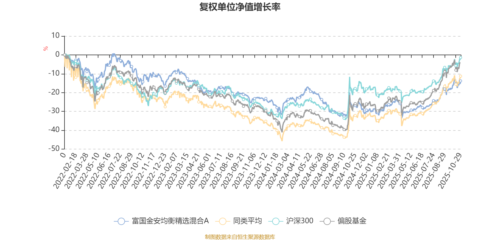 截至10月29日,富国金安均衡精选混合A近三个月复权单位净值增长率为13.60%,位于同类可比基金148/265;近半年复权单位净值增长率为23.75%,位于同类可比基金183/265;近一年复权单位净值增长率为18.81%,位于同类可比基金200/265;近三年复权单位净值增长率为0.12%,位于同类可比基金213/253。