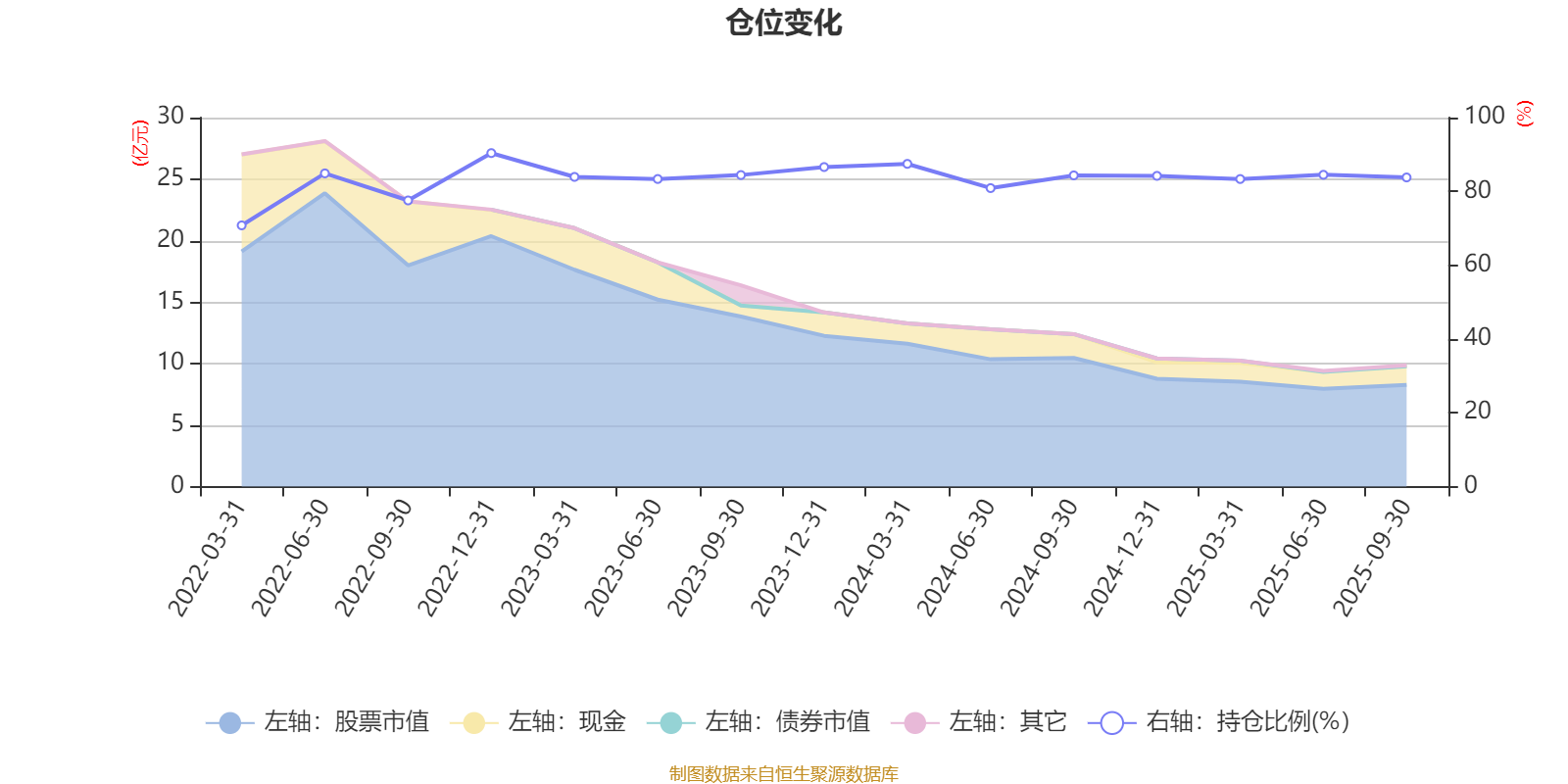 据定期报告数据统计,近三年平均股票仓位为84.77%,同类平均为85.99%。2022年末基金达到90.38%的最高仓位,2022年一季度末最低,为70.79%。