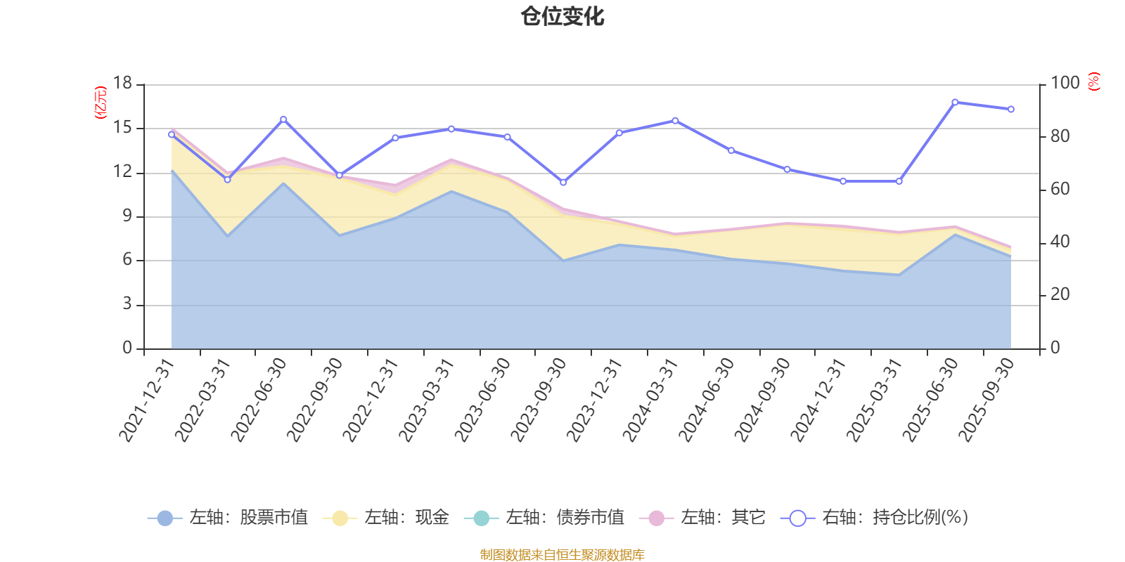 据定期报告数据统计,近三年平均股票仓位为77.26%,同类平均为85.99%。2025年上半年末基金达到93.23%的最高仓位,2023年三季度末最低,为62.93%。