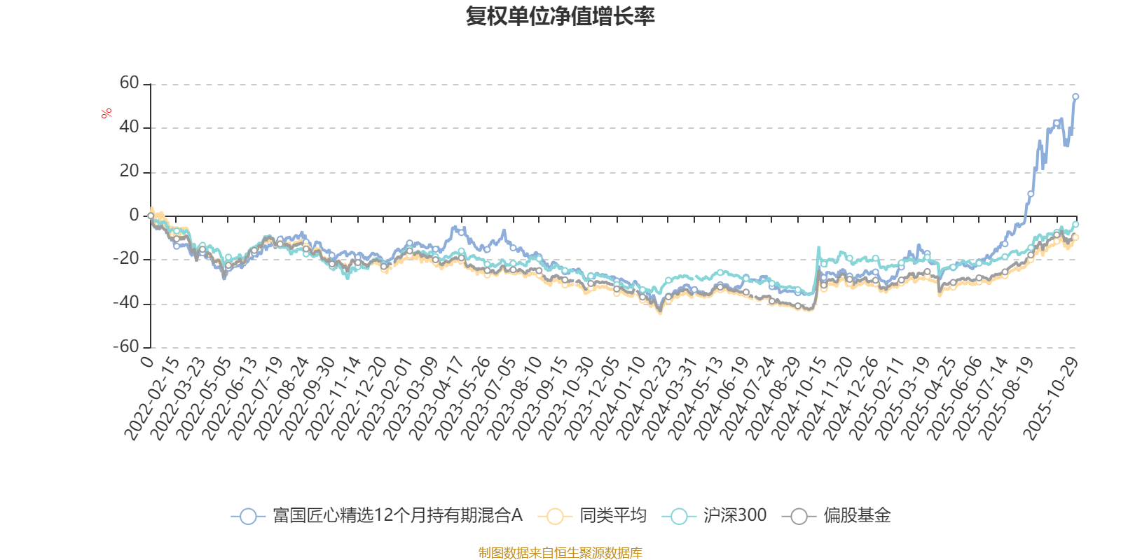 截至10月29日,富国匠心精选12个月持有期混合A近三个月复权单位净值增长率为60.07%,位于同类可比基金2/265;近半年复权单位净值增长率为100.68%,位于同类可比基金1/265;近一年复权单位净值增长率为109.66%,位于同类可比基金1/265;近三年复权单位净值增长率为89.58%,位于同类可比基金4/253。