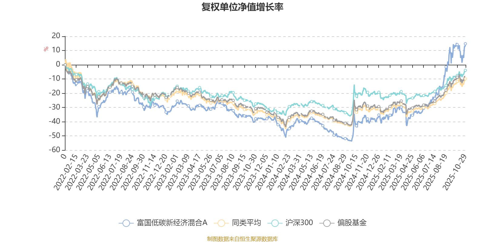 截至10月29日,富国低碳新经济混合A近三个月复权单位净值增长率为34.83%,位于同类可比基金26/265;近半年复权单位净值增长率为78.94%,位于同类可比基金8/265;近一年复权单位净值增长率为94.13%,位于同类可比基金3/265;近三年复权单位净值增长率为65.32%,位于同类可比基金12/253。
