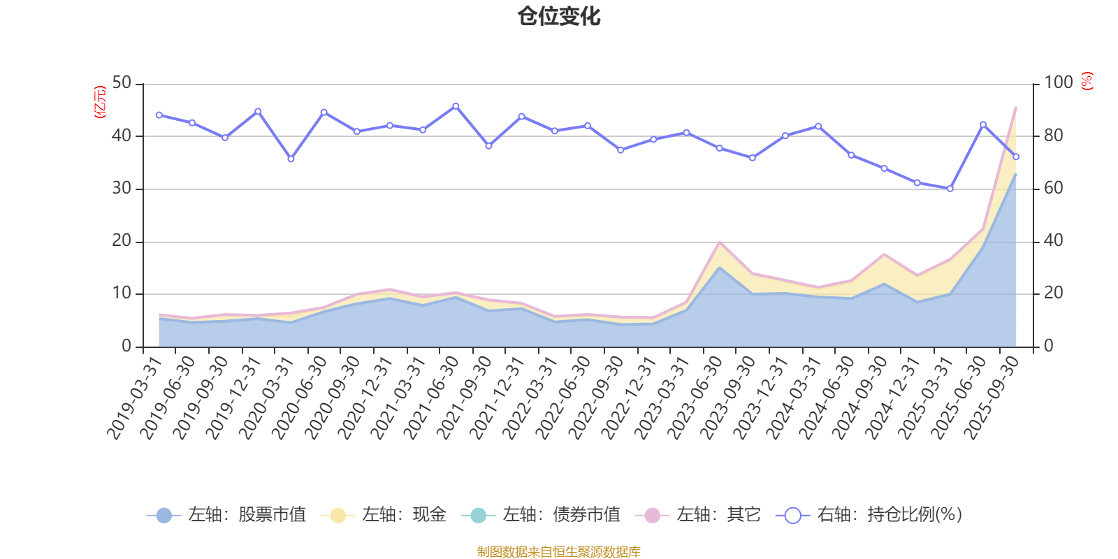 据定期报告数据统计,近三年平均股票仓位为74.35%,同类平均为87.62%。2021年上半年末基金达到91.53%的最高仓位,2025年一季度末最低,为60.19%。