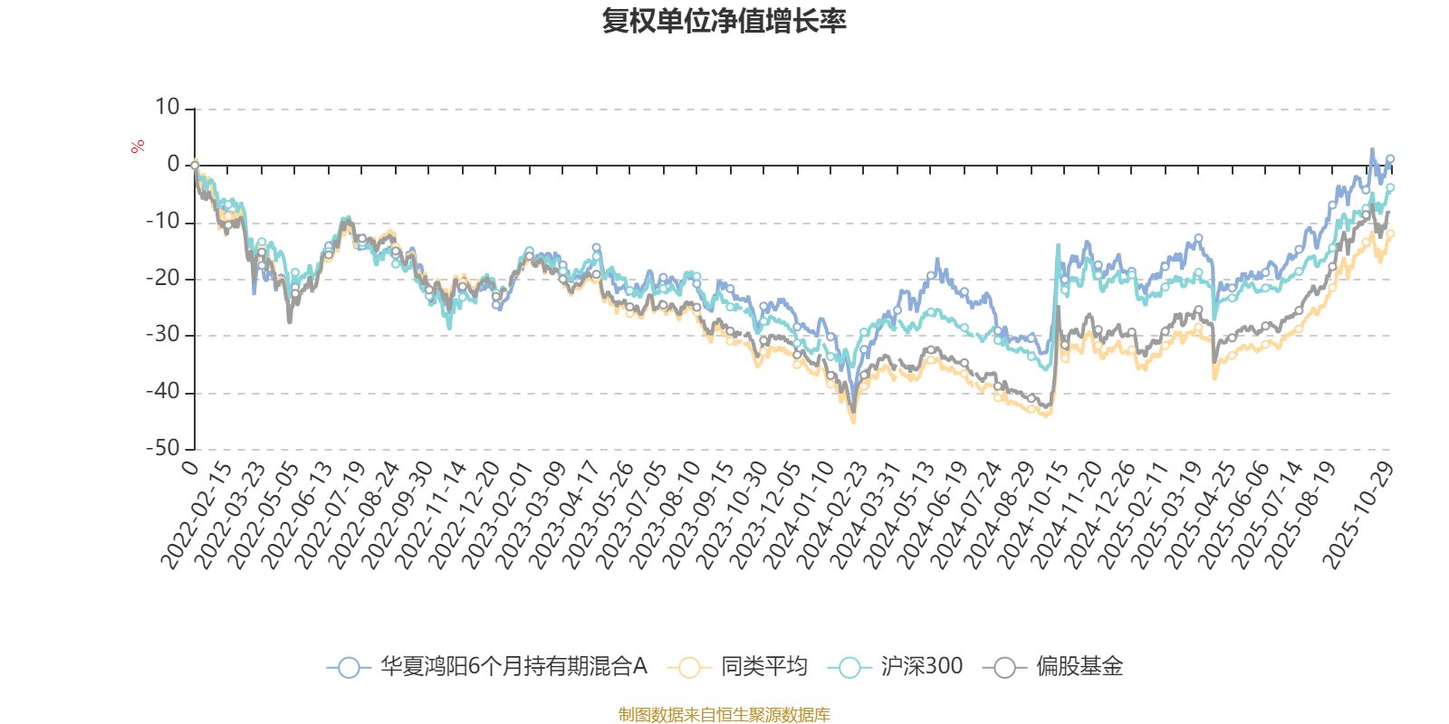 截至10月29日,华夏鸿阳6个月持有期混合A近三个月复权单位净值增长率为14.52%,位于同类可比基金90/185;近半年复权单位净值增长率为29.01%,位于同类可比基金100/185;近一年复权单位净值增长率为21.88%,位于同类可比基金128/181;近三年复权单位净值增长率为35.59%,位于同类可比基金54/175。