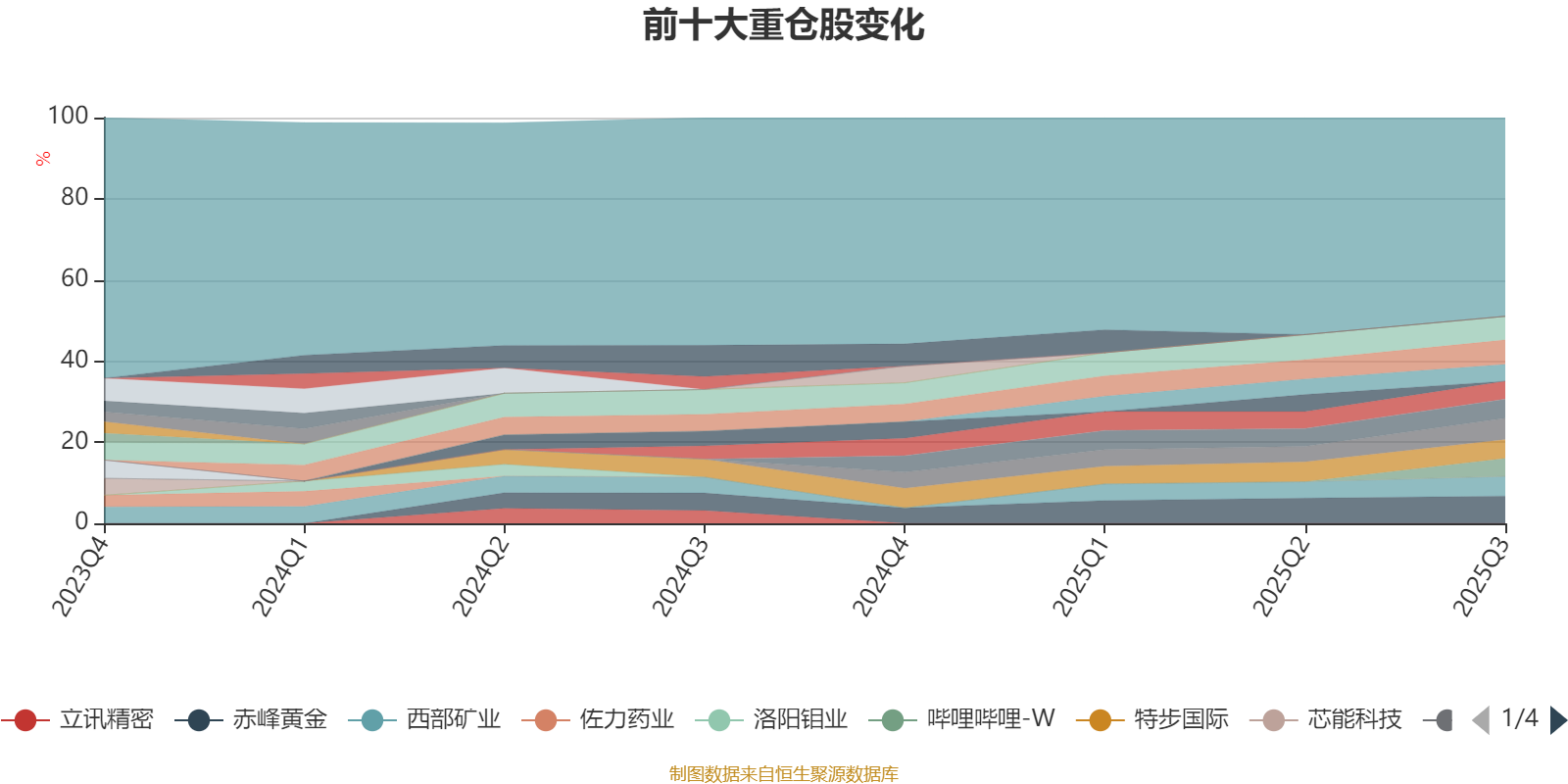 截至2025年三季度末,基金十大重仓股分别是赤峰黄金、天山铝业、中国铝业、宝钢股份、西部矿业、同程旅行、特步国际、哔哩哔哩-W、明阳电气、长城汽车。