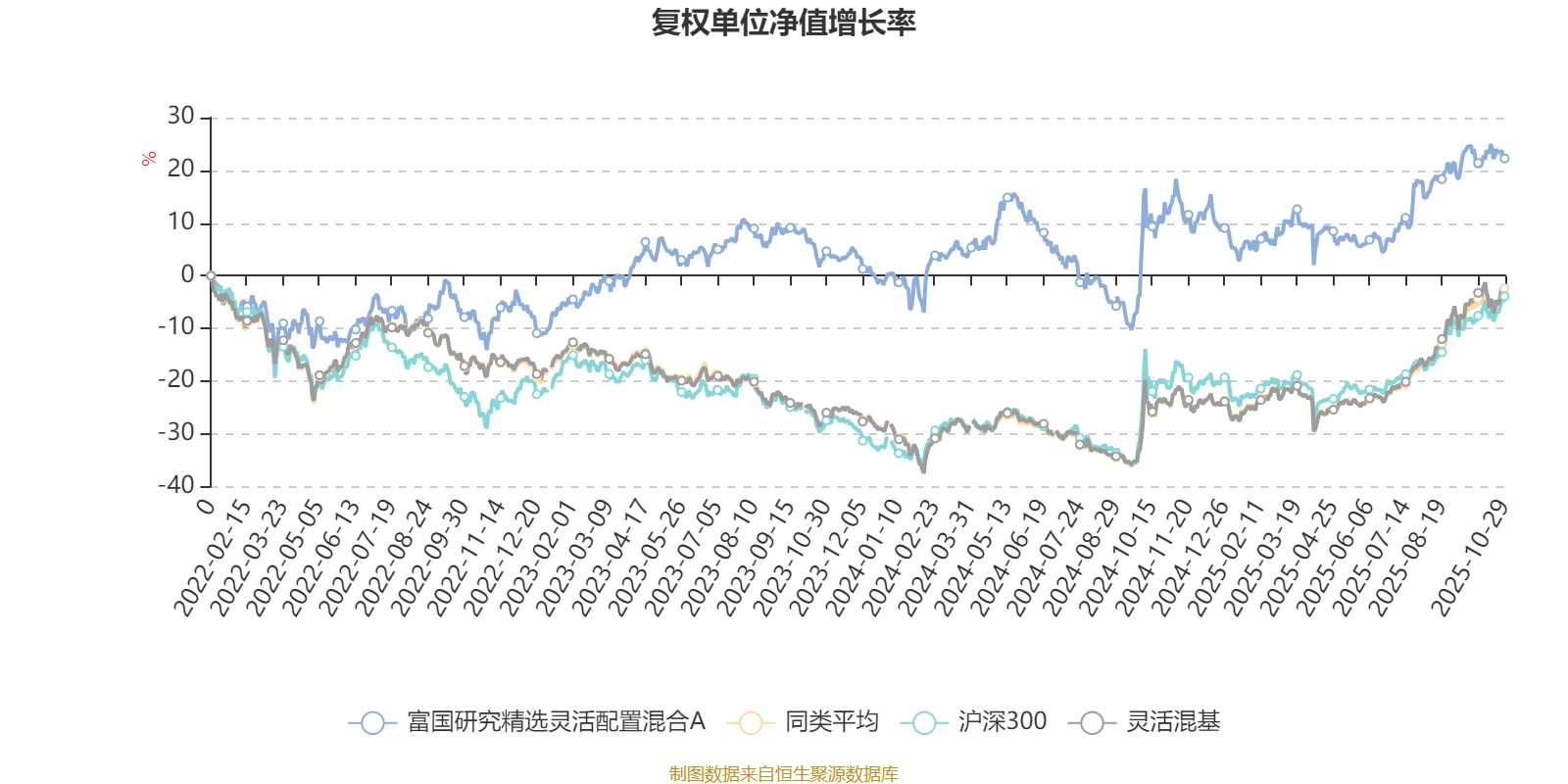 截至10月29日,富国研究精选灵活配置混合A近三个月复权单位净值增长率为3.73%,位于同类可比基金996/1287;近半年复权单位净值增长率为14.90%,位于同类可比基金920/1287;近一年复权单位净值增长率为9.11%,位于同类可比基金1014/1287;近三年复权单位净值增长率为38.59%,位于同类可比基金278/1286。