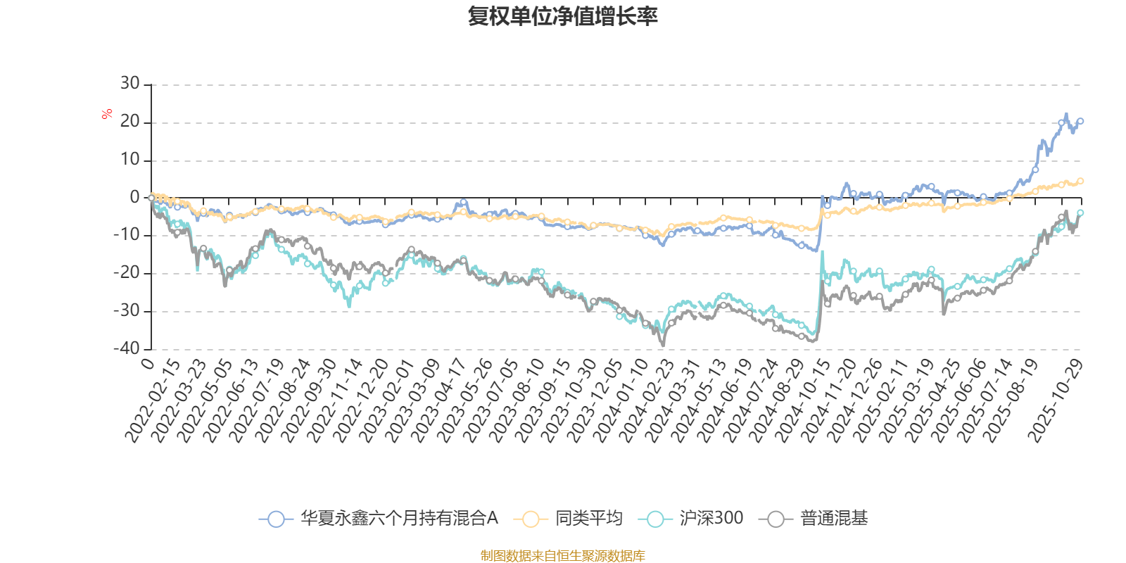 截至10月29日,华夏永鑫六个月持有混合A近三个月复权单位净值增长率为14.54%,位于同类可比基金4/629;近半年复权单位净值增长率为19.12%,位于同类可比基金18/629;近一年复权单位净值增长率为20.62%,位于同类可比基金24/623;近三年复权单位净值增长率为28.98%,位于同类可比基金27/557。