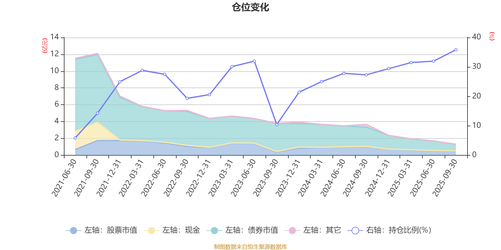 据定期报告数据统计,近三年平均股票仓位为26.94%,同类平均为19.14%。2025年三季度末基金达到35.83%的最高仓位,2021年上半年末最低,为5.84%。