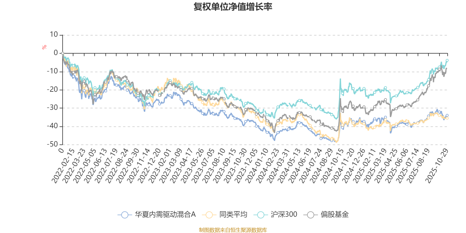 截至10月29日,华夏内需驱动混合A近三个月复权单位净值增长率为4.25%,位于同类可比基金22/85;近半年复权单位净值增长率为10.07%,位于同类可比基金18/85;近一年复权单位净值增长率为7.05%,位于同类可比基金41/82;近三年复权单位净值增长率为-3.84%,位于同类可比基金48/74。