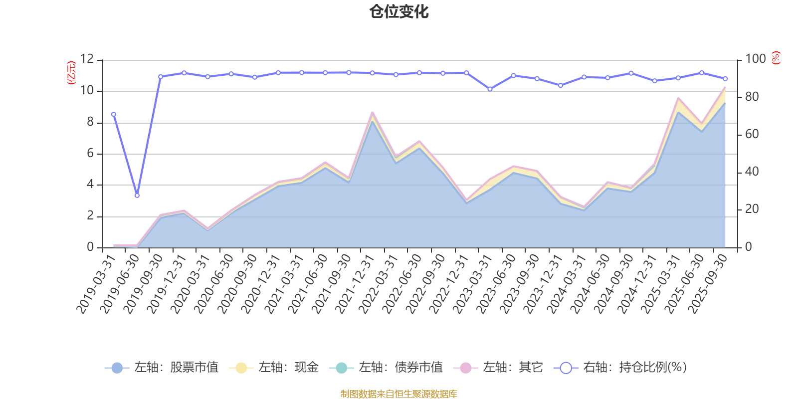 据定期报告数据统计,近三年平均股票仓位为90.17%,同类平均为72.35%。2021年三季度末基金达到93.28%的最高仓位,2019年上半年末最低,为27.79%。