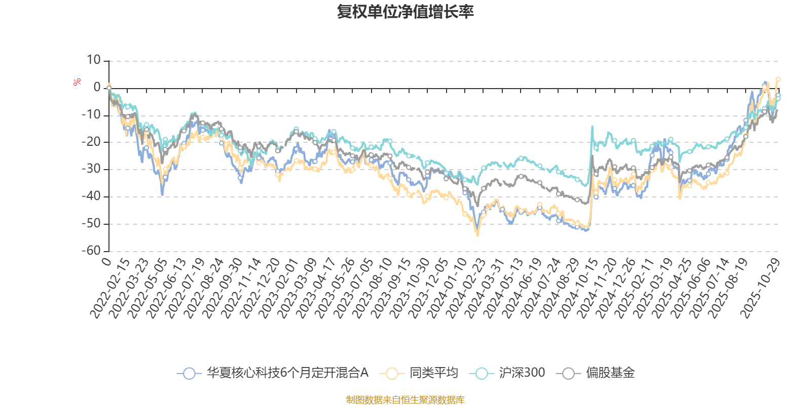 截至10月29日,华夏核心科技6个月定开混合A近三个月复权单位净值增长率为18.18%,位于同类可比基金183/229;近半年复权单位净值增长率为45.89%,位于同类可比基金137/229;近一年复权单位净值增长率为55.94%,位于同类可比基金114/213;近三年复权单位净值增长率为40.63%,位于同类可比基金92/158。