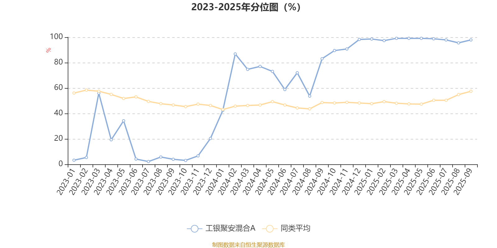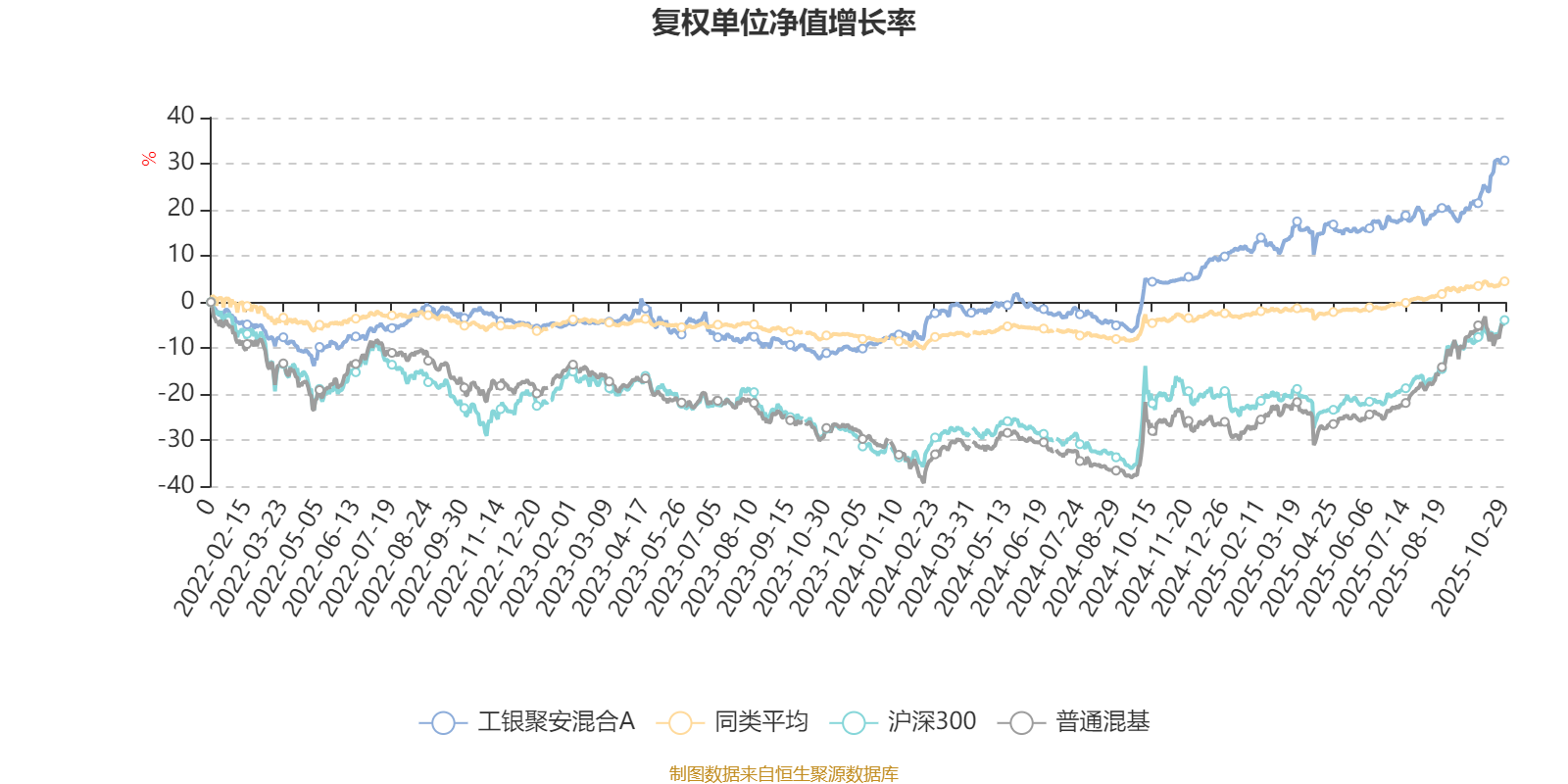 截至10月29日,工银聚安混合A近三个月复权单位净值增长率为9.14%,位于同类可比基金34/629;近半年复权单位净值增长率为13.08%,位于同类可比基金56/629;近一年复权单位净值增长率为25.41%,位于同类可比基金14/623;近三年复权单位净值增长率为34.05%,位于同类可比基金16/557。