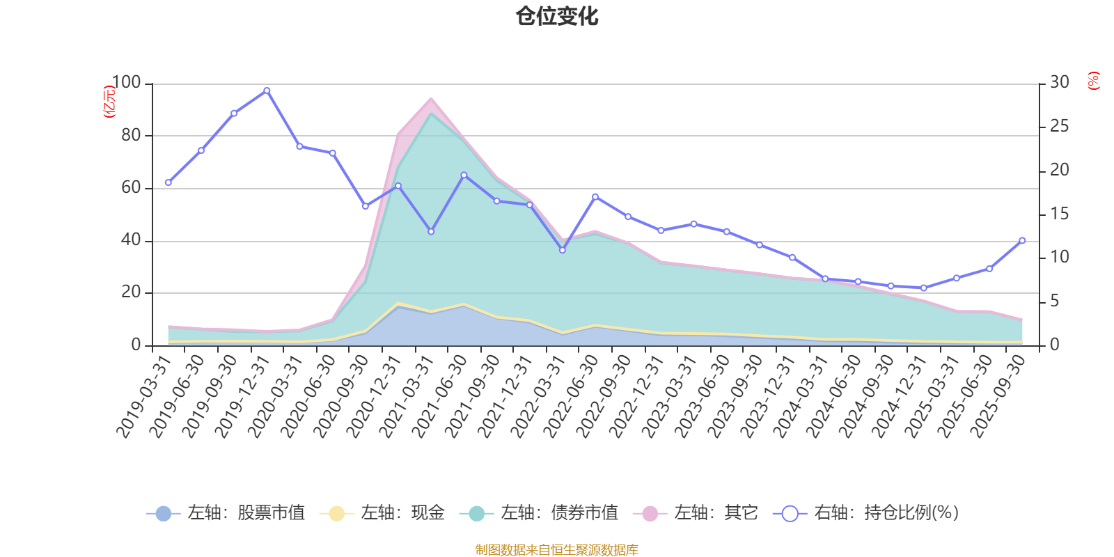 据定期报告数据统计,近三年平均股票仓位为9.9%,同类平均为72.35%。2019年末基金达到29.2%的最高仓位,2024年末最低,为6.61%。