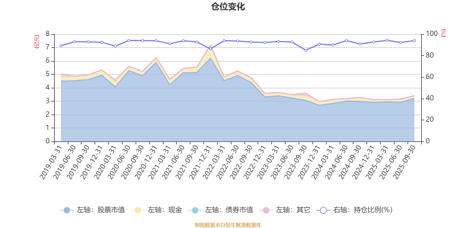 据定期报告数据统计,近三年平均股票仓位为91.85%,同类平均为85.66%。2025年一季度末基金达到94.29%的最高仓位,2023年三季度末最低,为85.11%。