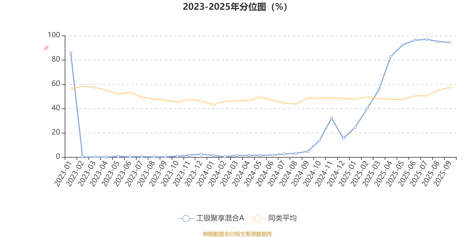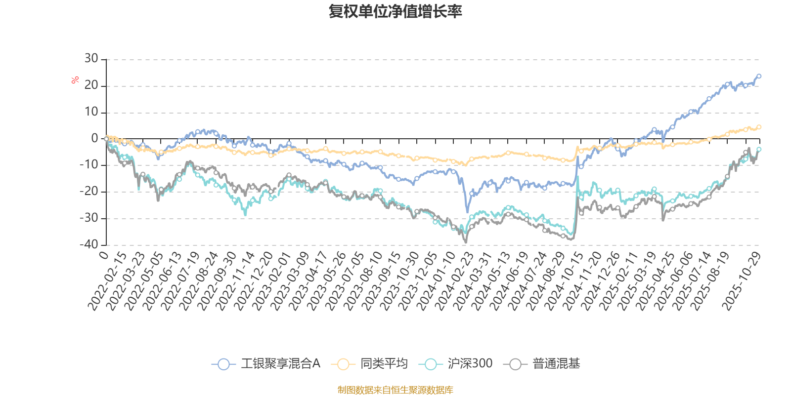 截至10月29日,工银聚享混合A近三个月复权单位净值增长率为5.35%,位于同类可比基金100/629;近半年复权单位净值增长率为17.84%,位于同类可比基金20/629;近一年复权单位净值增长率为32.72%,位于同类可比基金6/623;近三年复权单位净值增长率为26.50%,位于同类可比基金37/557。